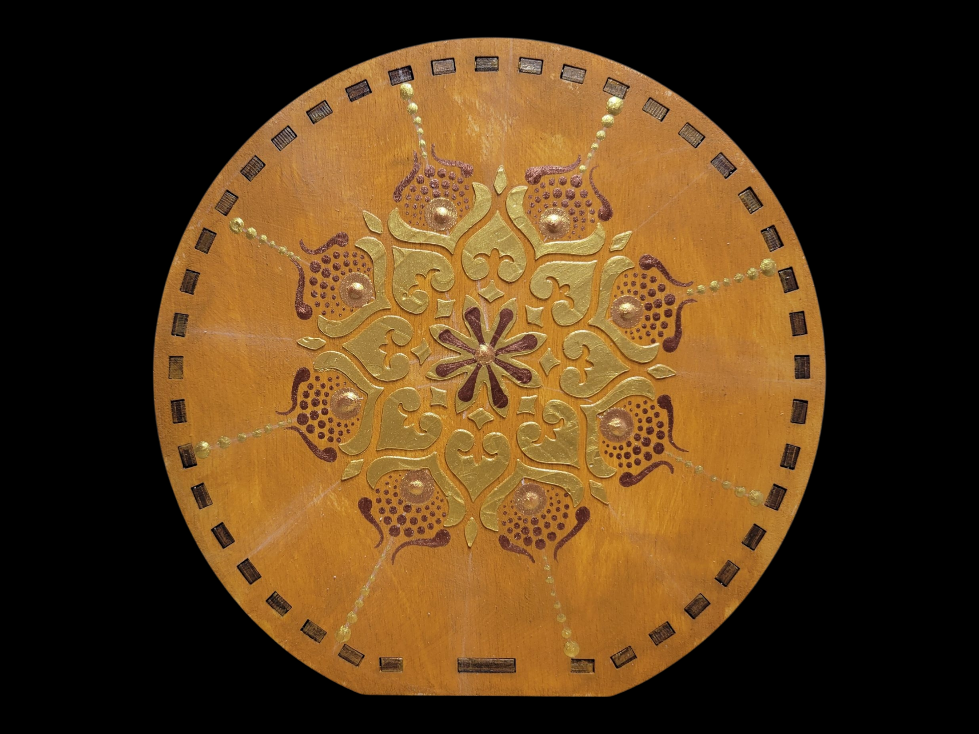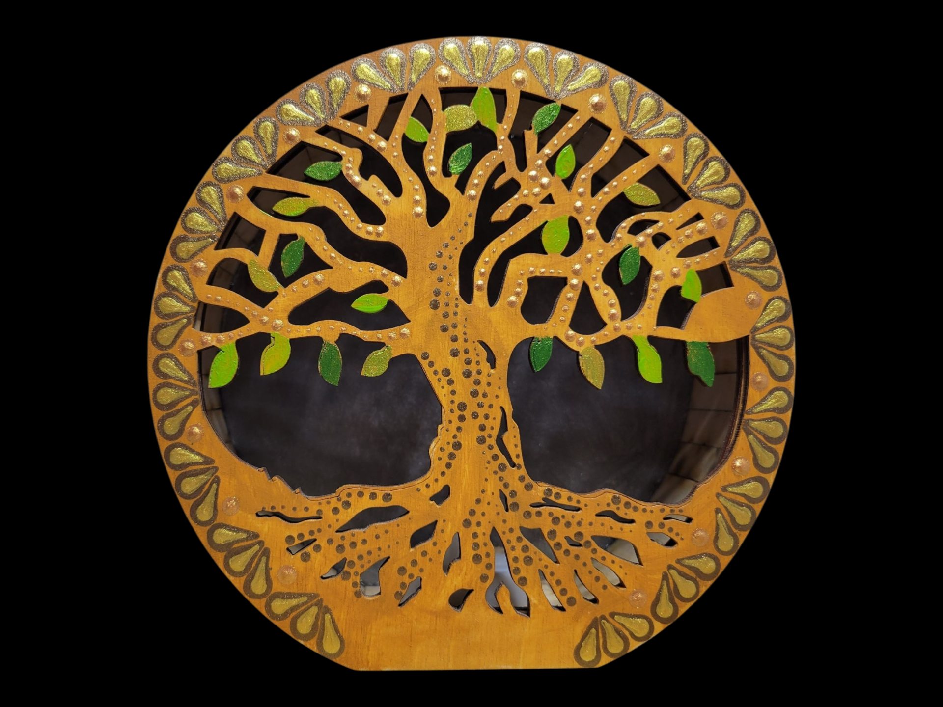 Diese stimmungsvolle Nachtlampe aus Holz wurde liebevoll von Hand bemalt und zeigt einen stilisierten Lebensbaum mit verzweigten Wurzeln und Ästen, umrahmt von einem gold-braunen Blätterkranz. Die grünen Blätter und feinen Perlendetails verleihen dem Motiv Tiefe und Lebendigkeit, während der dunkle Hintergrund die Farben besonders schön hervorhebt.